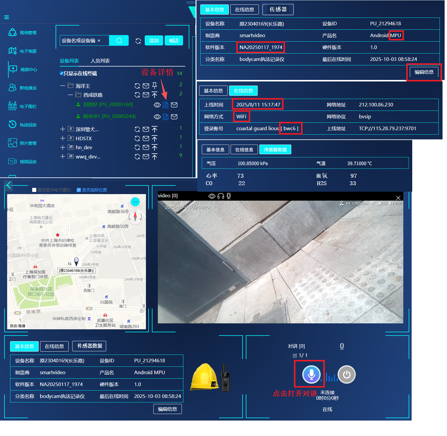 - 可在“视频中心”查看左侧的设备列表,从中调阅在线设备的实时回传的视频+音频; 可调取PTZ操作菜单,可截图、录像、旋转等;
