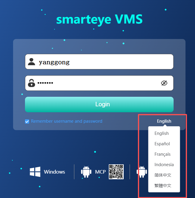 针对自建的smarteye server,默认的内建用户账号为:admin/123456,可通过WEB客户端以及传统的C/S客户端及手机客户端MCP进行登录。