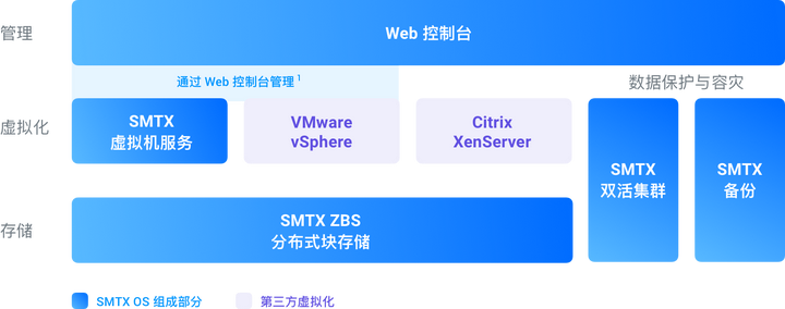 由于很多读者对超融合构成还比较混淆,以下以 SmartX 的超融合软件 SMTX OS 为例说明分布式存储和其他模块的关系。