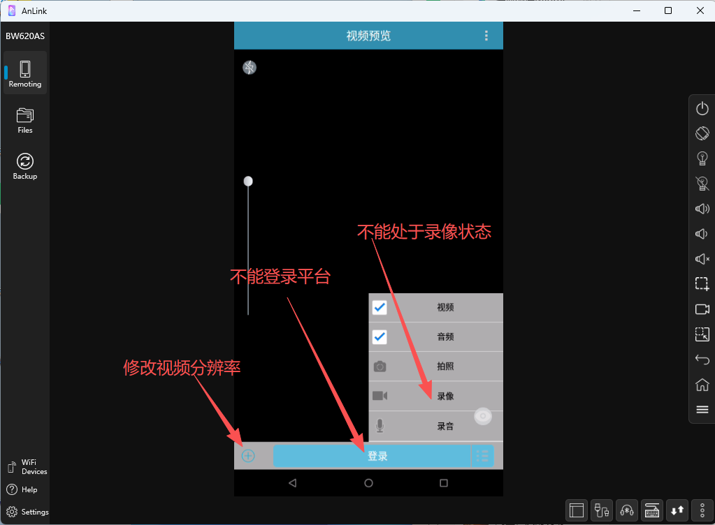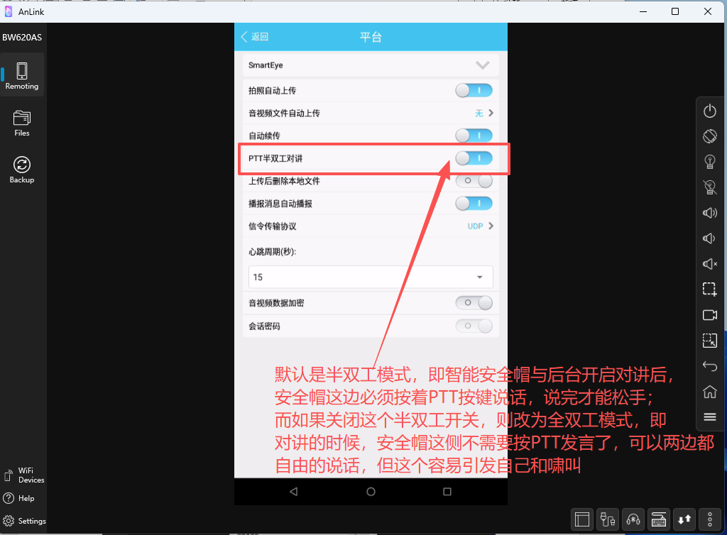 而智能安全帽由于去掉了LCD显示屏,因此操作配置方面还需要依赖电脑上的投屏软件anlink,比执法记录仪的操作略显麻烦一些。