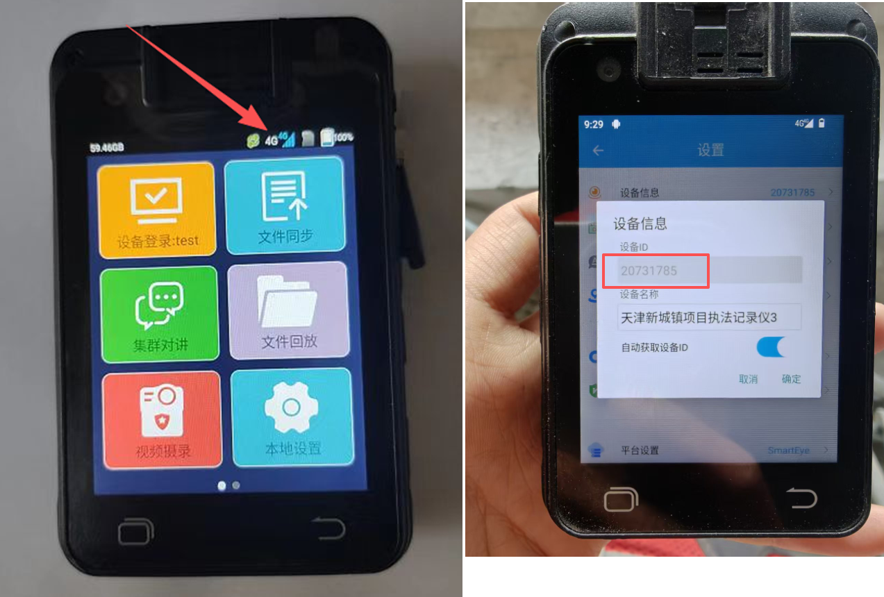 设备没上线,首先看执法记录仪屏幕顶部的4G信号,并请告知设备ID,遇到不上线的故障问题,就请按下图提供信息,如下图示: