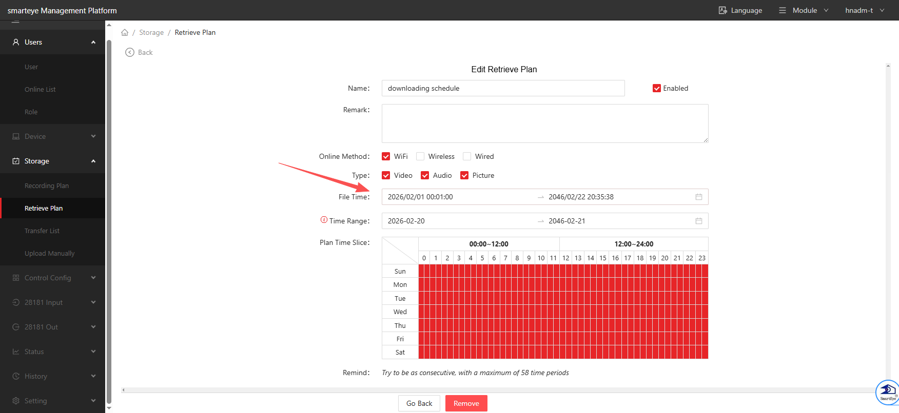 this schedule is to download all the recording files within a camera when it's online in VMS/smarteye. better set it to work only at WiFi connected instead of 4G/5G cell network to save dataflow cost.