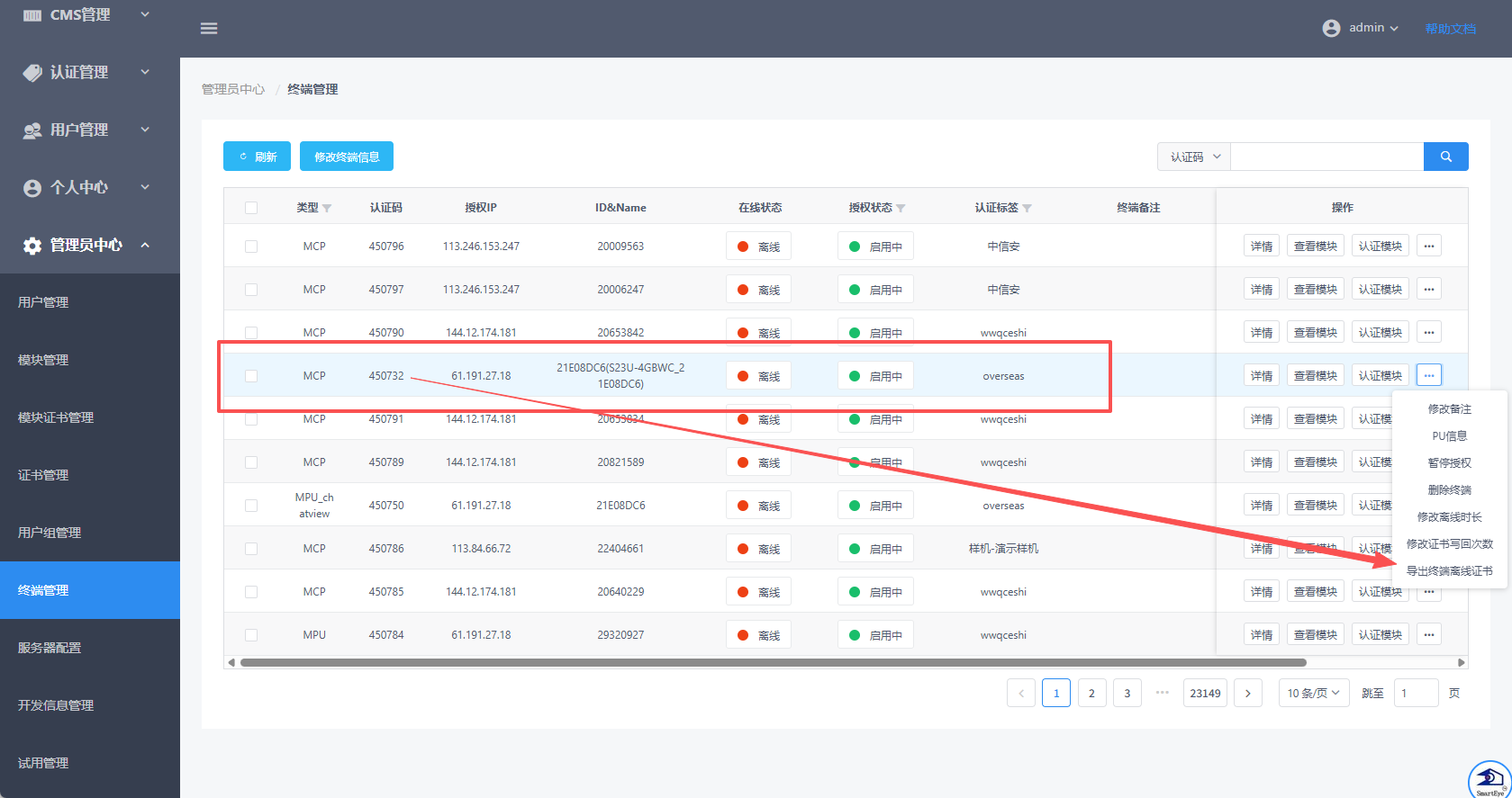后台CMS管理 - 添加终端 - 认证 , 用admin---》 终端管理 -导出离线证书。