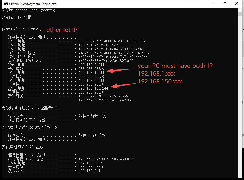 so your PC must have both IP for access, 192.168.1.xxx and 192.168.150.xxx.