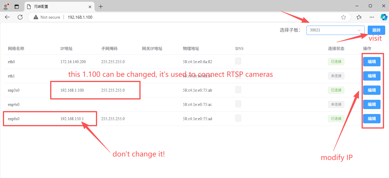 1) 192.168.1.100 , this is for user interface, WEB visit, connection to RTSP cameras in LAN, this IP can be changed according to user local network