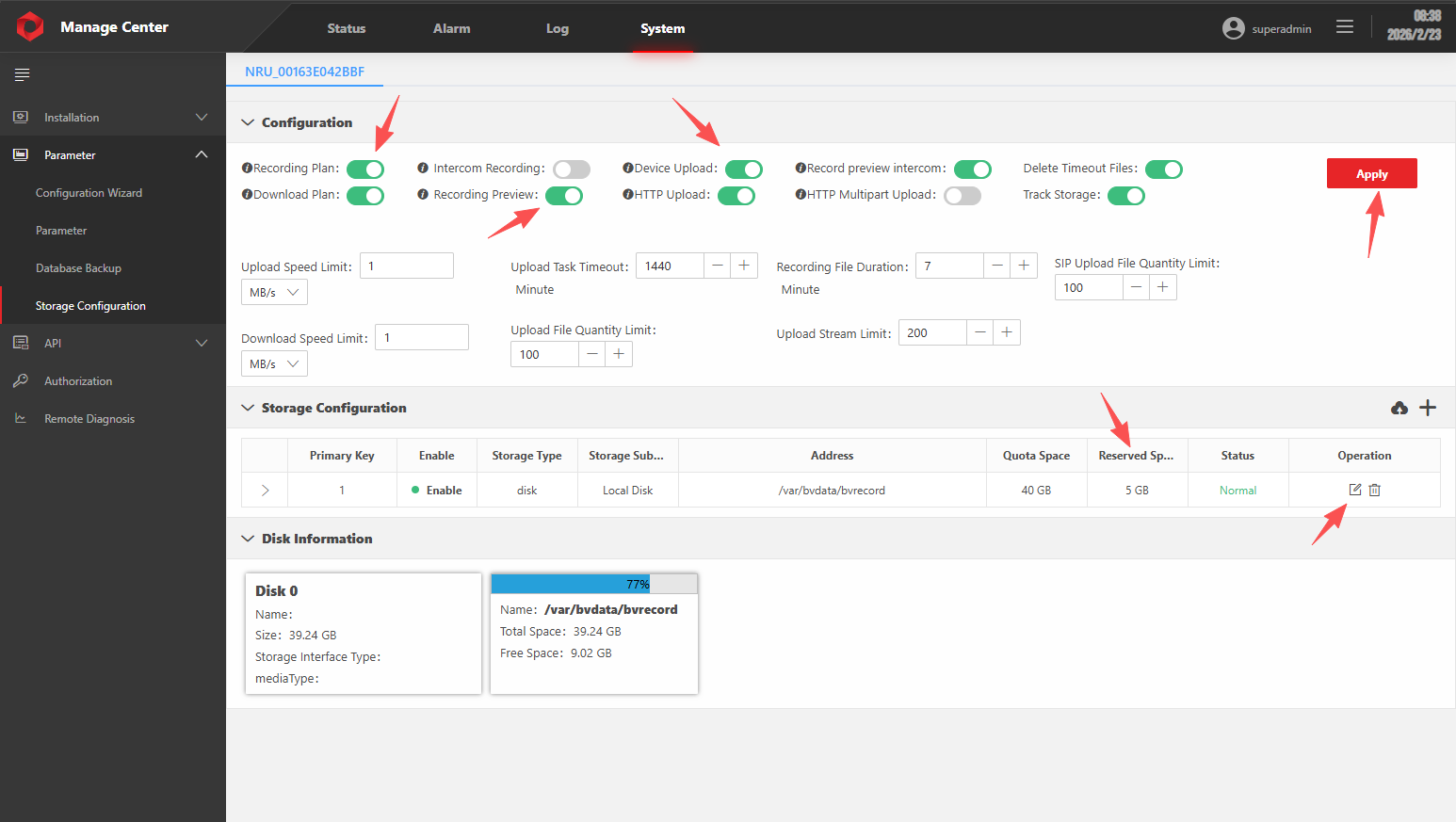 system-level settings, like stream protocol ports settings, storage settings, server-status, server software update etc.