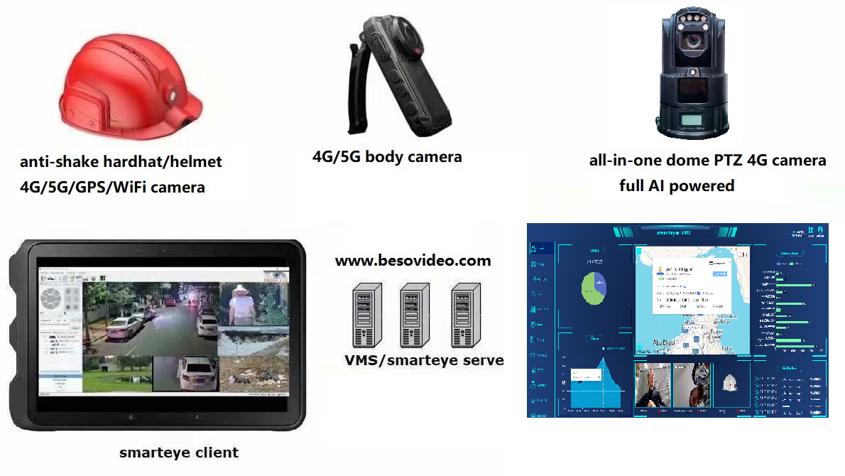 anti-jitter, star-light night vision, explosion-proof 4G/5G/GPS body camera DVR, 4G/5G/GPS helmet camera DVR/hardhat camera, AI box, vehicle mount mDVR, GPS tracker, 4G/5G HDMI DVR for drones/UAV, fixed/cable IPcamera, all-in-one dome PTZ 4G/5G camera, RTK/UWB, 4G torch camera DVR, glass camera/AR glass camera, all in large scale VMS/smarteye.