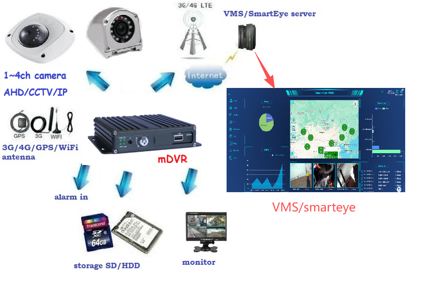 车载DVR/NVR,可支持1~4/8路AHD或者IPCamera接入,录像存储(SD卡或硬盘HDD),可4G/5G实时回传后台指挥中心~融合通信~统一视频平台VMS/smarteye,记录GPS/BD轨迹并可轨迹回放,可与设备对讲通话。